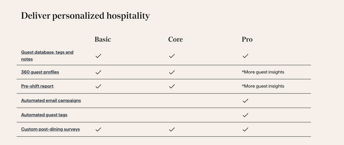 Here's the part I'll catch heat for: Pro is oversold. In my experience, roughly one in three restaurants paying for Pro should be on Core. The automation features are nice. They're not $2,400-a-year nice unless you're actually using every one of them. If your hosts are tagging regulars in a notebook and your marketing emails go out from Mailchimp, you are paying for an upgrade you don't touch.