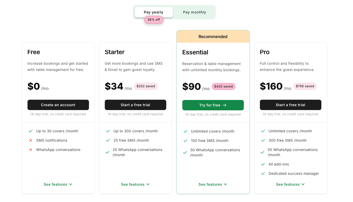 - Resy — from about $249/month, owned by American Express. Tock is set to merge into Resy this summer following Amex's February 2026 announcement, which will roughly double Resy's venue footprint. Strong in urban US fine dining. See our OpenTable vs Resy breakdown for the plan-by-plan comparison, and Resy alternatives if neither fits.