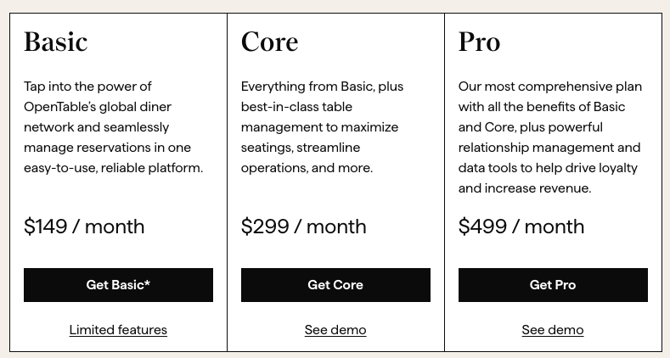 OpenTable offers three plans for restaurants: Basic at $149 per month, Core at $299, and Pro at $499. Each plan also carries per cover network fees of $1 to $1.50 and, as of early 2026, a 2% service fee on transactions like deposits and prepaid experiences.
