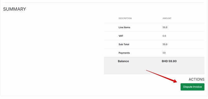 - Scroll to the bottom of the page or Summary section and click Dispute Invoice.