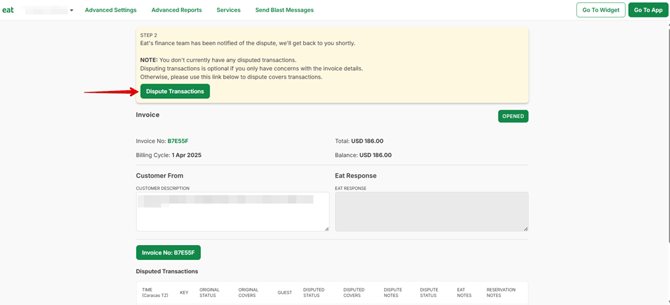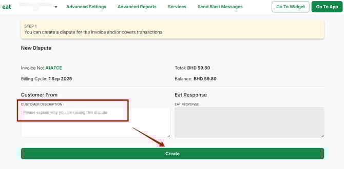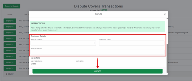- Click Create to submit the dispute. Eat's finance team will be notified of the dispute and will get back to you shortly.