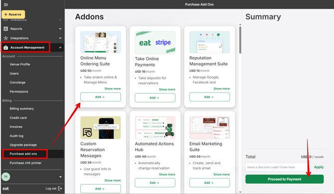 - Click the Proceed to Payment button, and follow the prompts to complete the purchase. Your new add-ons will be activated immediately upon successful payment.