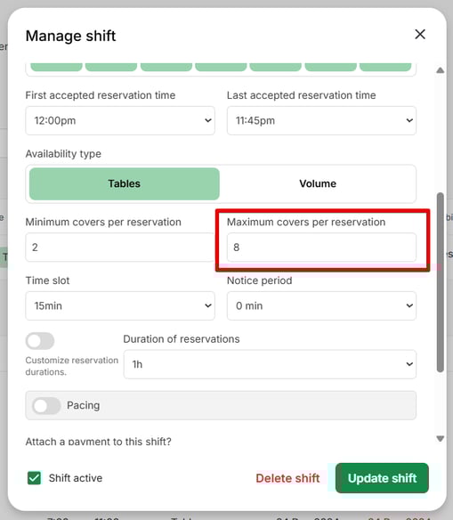 - Maximum covers per reservation